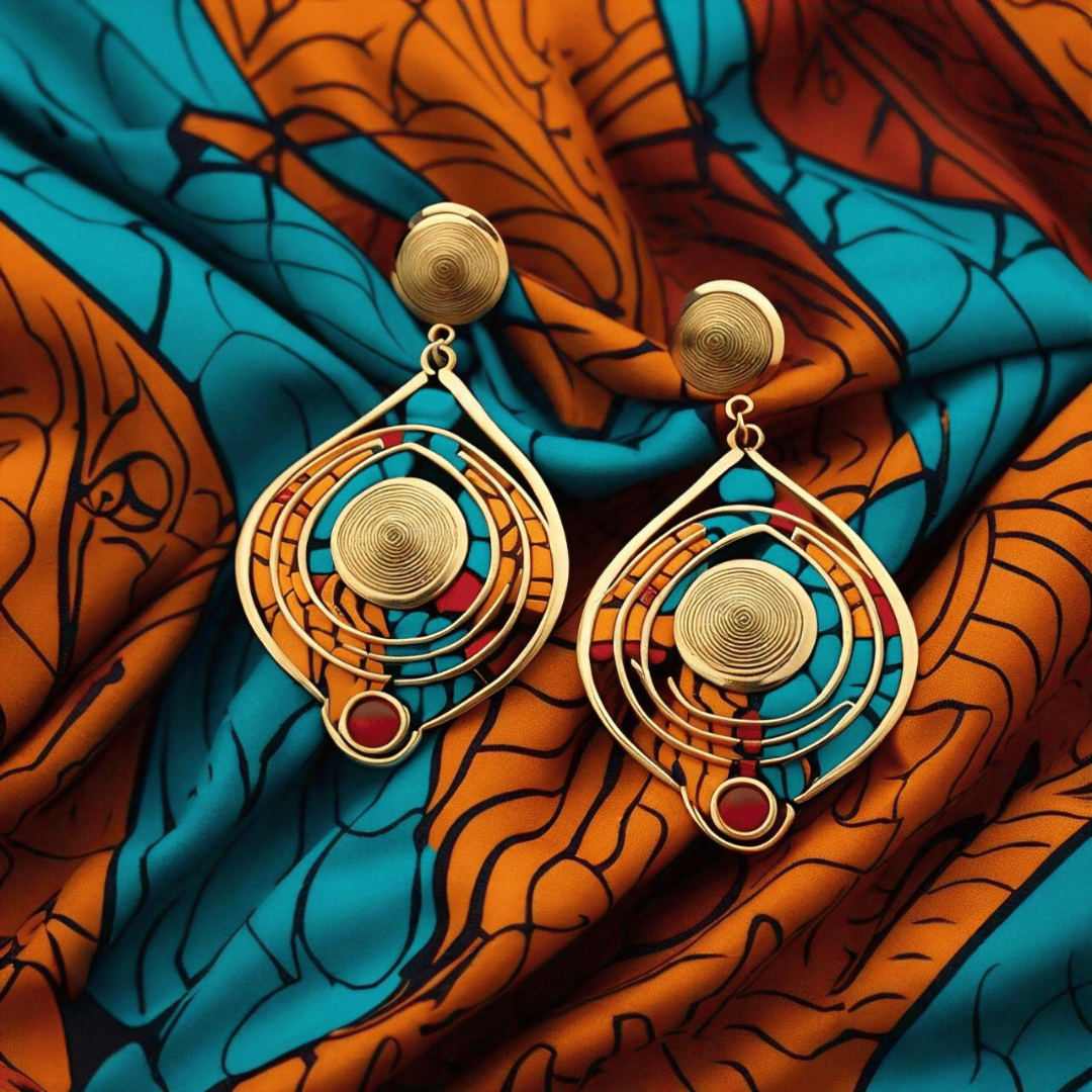 These earrings reflect Angola’s vibrant artistry**, featuring **concentric spiral motifs** symbolizing **continuity and life’s cycles**, framed within teardrop shapes inspired by **traditional tribal adornments**. The touches of **turquoise blue and deep red** echo the hues of **Angolan textiles**, celebrating harmony between **earth, spirit, and culture.