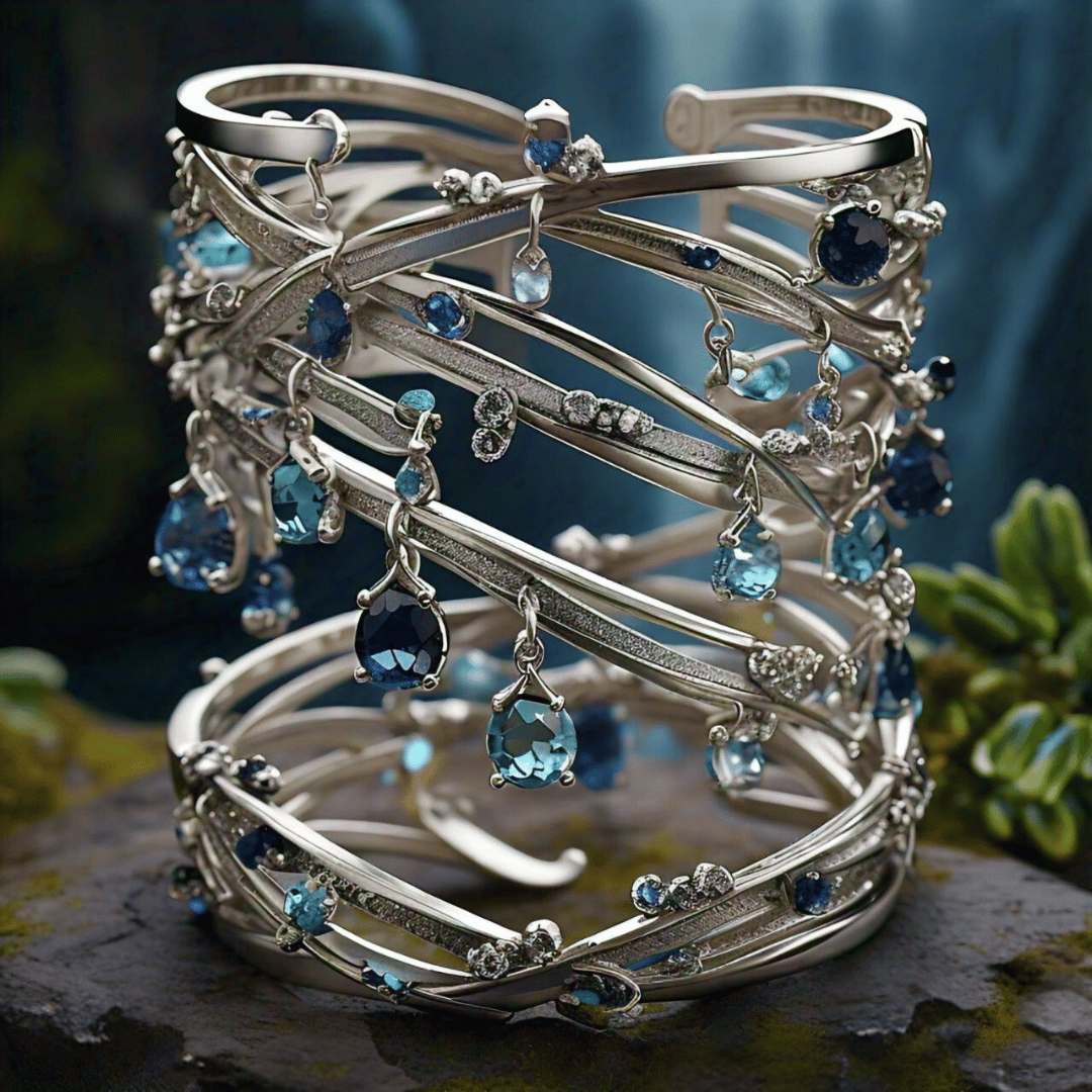 This elegant silver cuff bracelet, adorned with cascading blue gemstones, seems to draw inspiration from **Angola’s rivers and coastal waters** — particularly the shimmering blues of the **Kwanza River** and the **Atlantic Ocean**. The intertwined metal bands evoke flowing currents, while the dangling gems resemble droplets of water catching the Angolan sun.