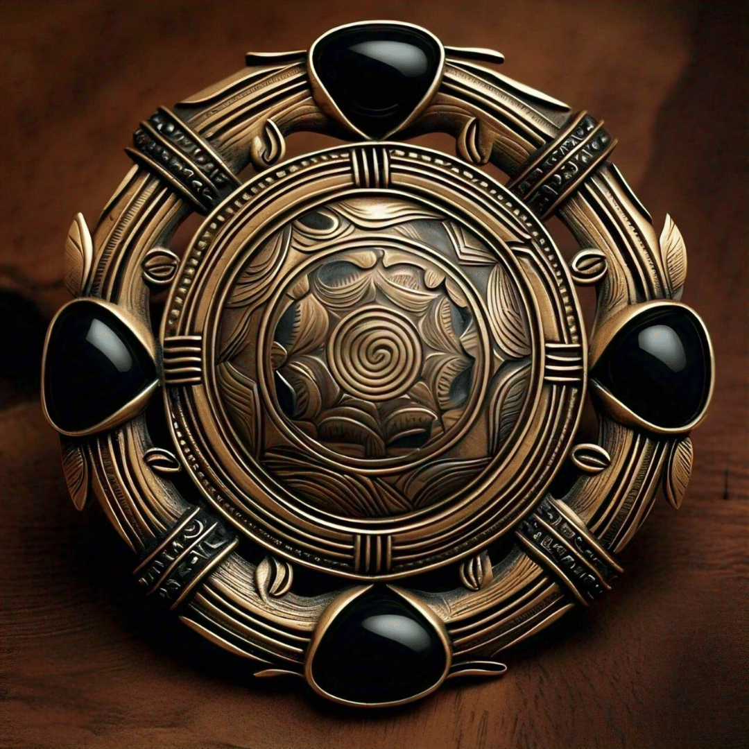 This bronze medallion-like jewelry piece, set with deep black stones, reflects **Angola’s ancient tribal motifs and earthy spirit**. The spiral patterns at the center resemble **traditional Angolan carvings symbolizing life’s continuity and unity**, while the surrounding teardrop stones echo the **rich soils and dark gemstones of the region**, giving it a regal, grounded presence rooted in heritage and strength.