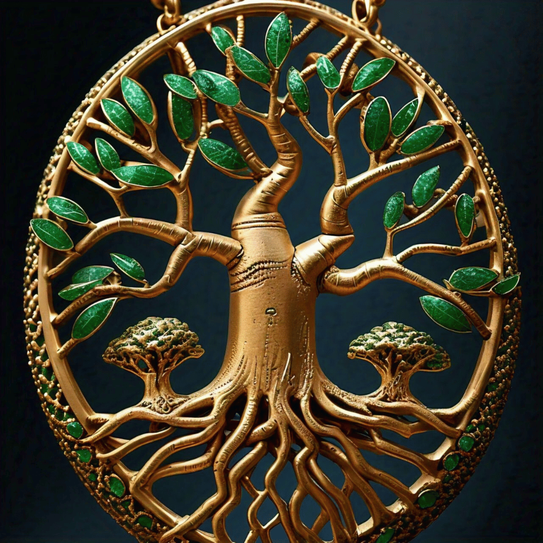 This jewelry piece beautifully symbolizes **Angola’s deep connection to nature and ancestry**, featuring a golden **Baobab tree motif**—the “Tree of Life” in African culture. The intertwining roots and emerald-green leaves represent **growth, heritage, and renewal**, while the circular frame evokes the **cycle of life and unity between earth and spirit** that defines Angola’s cultural essence.