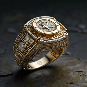 This gold ring captures Angola’s spirit of exploration and resilience featuring a compass motif** at its center that symbolizes **guidance, direction, and strength**. The intricate geometric engravings evoke **Luanda’s colonial architecture and maritime heritage**, while the diamonds represent **clarity and perseverance**, echoing Angola’s journey through time toward progress and unity.