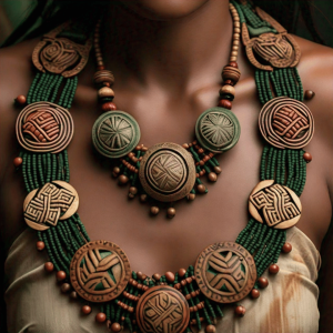 This necklace embodies **Angola’s rich tribal heritage**, featuring **circular bronze medallions** engraved with **geometric motifs** that reflect traditional **Chokwe symbolism of unity and balance**. The **earthy green and brown beads** signify a connection to **the land and ancestral strength**, creating a powerful expression of **cultural pride and identity**.